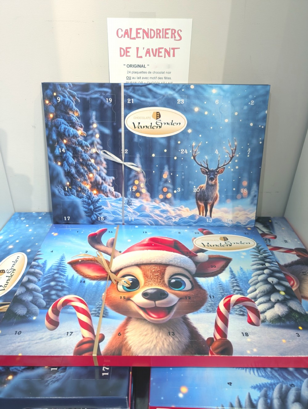 Les calendriers ORIGINAL : 24 plaquettes de chocolat avec motif des fêtes en relief, noir ou au lait. Disponibles dès maintenant à la boutique. Réservez à l’avance votre calendrier par téléphone ou magasinez en ligne.